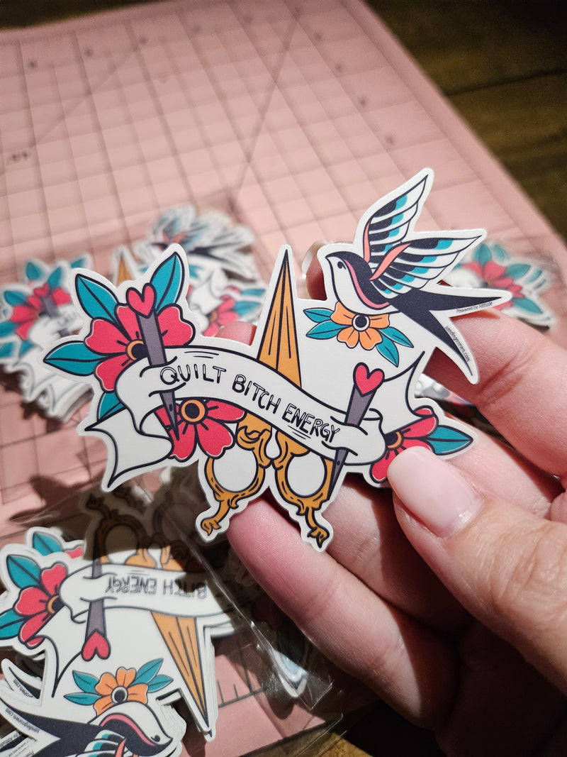 This 2" x 3" sticker is packed with bold attitude and classic tattoo-inspired style—featuring hand-drawn flowers, bird in flight, and a whole lot of Quilt B Energy. Designed by me, Charleigh Dot Designs, for quilters who know they've got it and love to flaunt it!