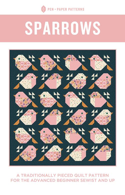 The Sparrows Quilt Pattern (65 1/2" x 71") is a block based pattern for the advanced beginner sewist and up. The pattern includes instruction for making a scrappy version of the quilt using fat quarters.