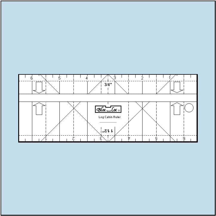 Ruler trims to 3/4” finished on one side and 1 1/2” finished strips on the  opposite side.  To make 3/4” finished logs, cut oversized strips 1 1/2” wide. To make 1 1/2” finished logs, cut strips 2 1/4” wide.  Cut center square any size you wish or make a block as the center. It’s incredibly simple—just sew, lock on & trim!