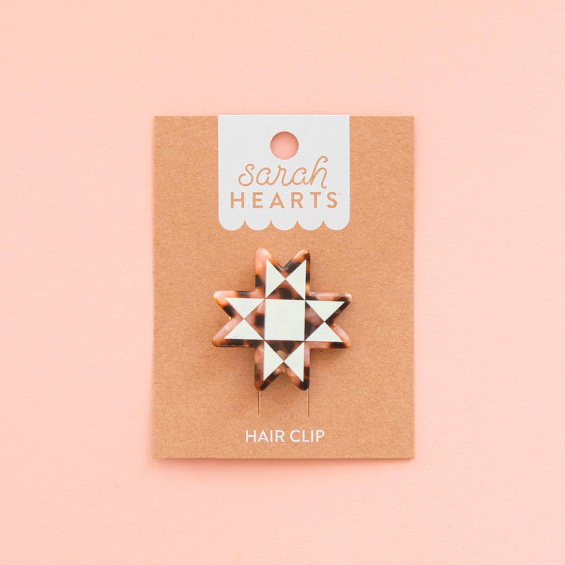 Elevate your hair game with our Quilt Star Hair Clip, inspired by the timeless sawtooth star quilt block. Featuring a chic blend of brown and blush pink tortoise shell with a cream screen-printed design, this petite barrette brings a modern twist to a classic motif.