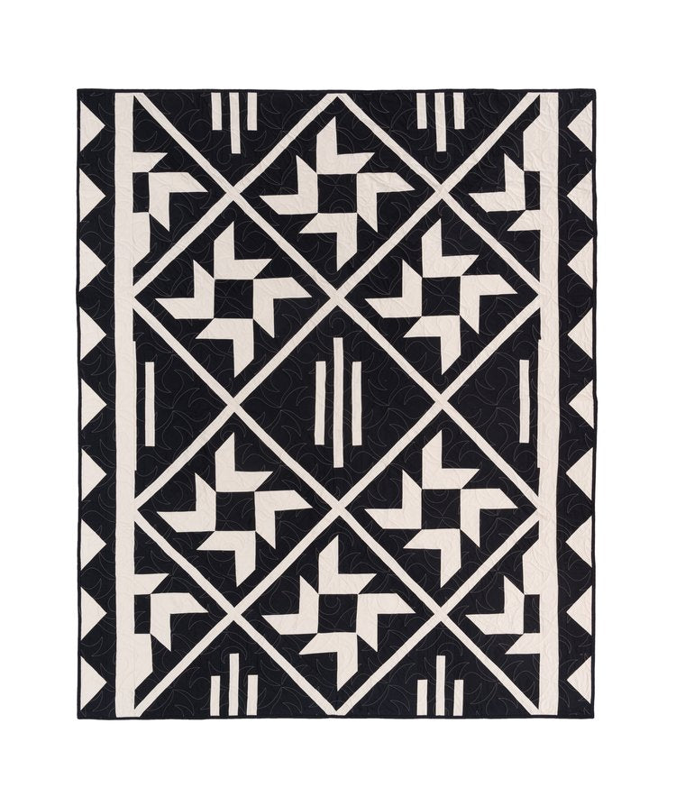 The Ponderosa Quilt was inspired by the wildfire adaptations of ponderosa forests. The flying geese blocks represent the incredibly thick bark that protects the inner tree from flames, and the vertical strips represent the self pruning behavior that drops dead branches to protect the core of the tree.