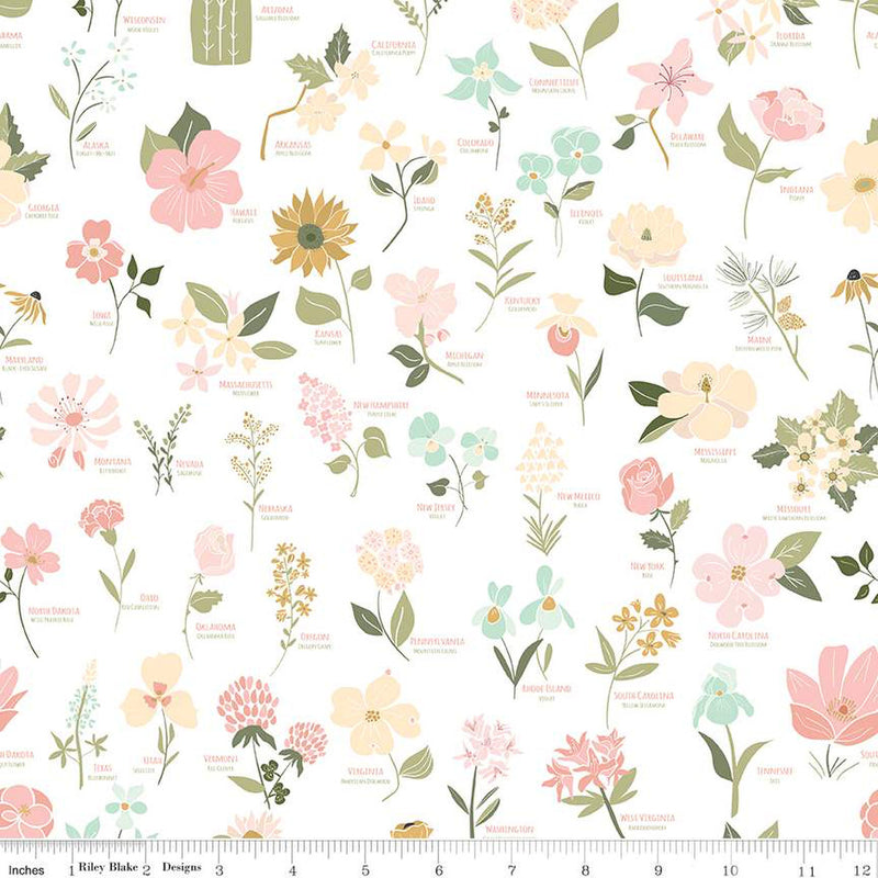 Item Description: Wild and Free by Gracey Larson for Riley Blake Designs is great for quilting, apparel and home decor. This print features state flowers with the name of the state and flower.